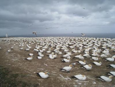 Heute sind wir eine weitere Strecke (knapp 300 km) zum Cape Kidnappers gefahren. Dort haben wir uns die Gannets (eine Moewenart) angesehen die dort in einer grossen Kolonie leben. Die Tour ist nur bei Ebbe moeglich und mit Trecker und Wagen recht holprig. Vor Ort muss man dann "nur" noch 30 min auf die Klippen laufen und schon ist man da :-)