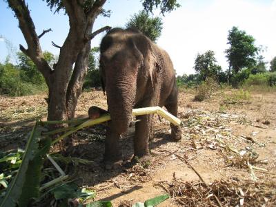 Unser "Job" bestand unter anderem darin die Elefanten mit Bananenpflanzen zu versorgen. Unglaublich wie viele die davon verdruecken koennen ...